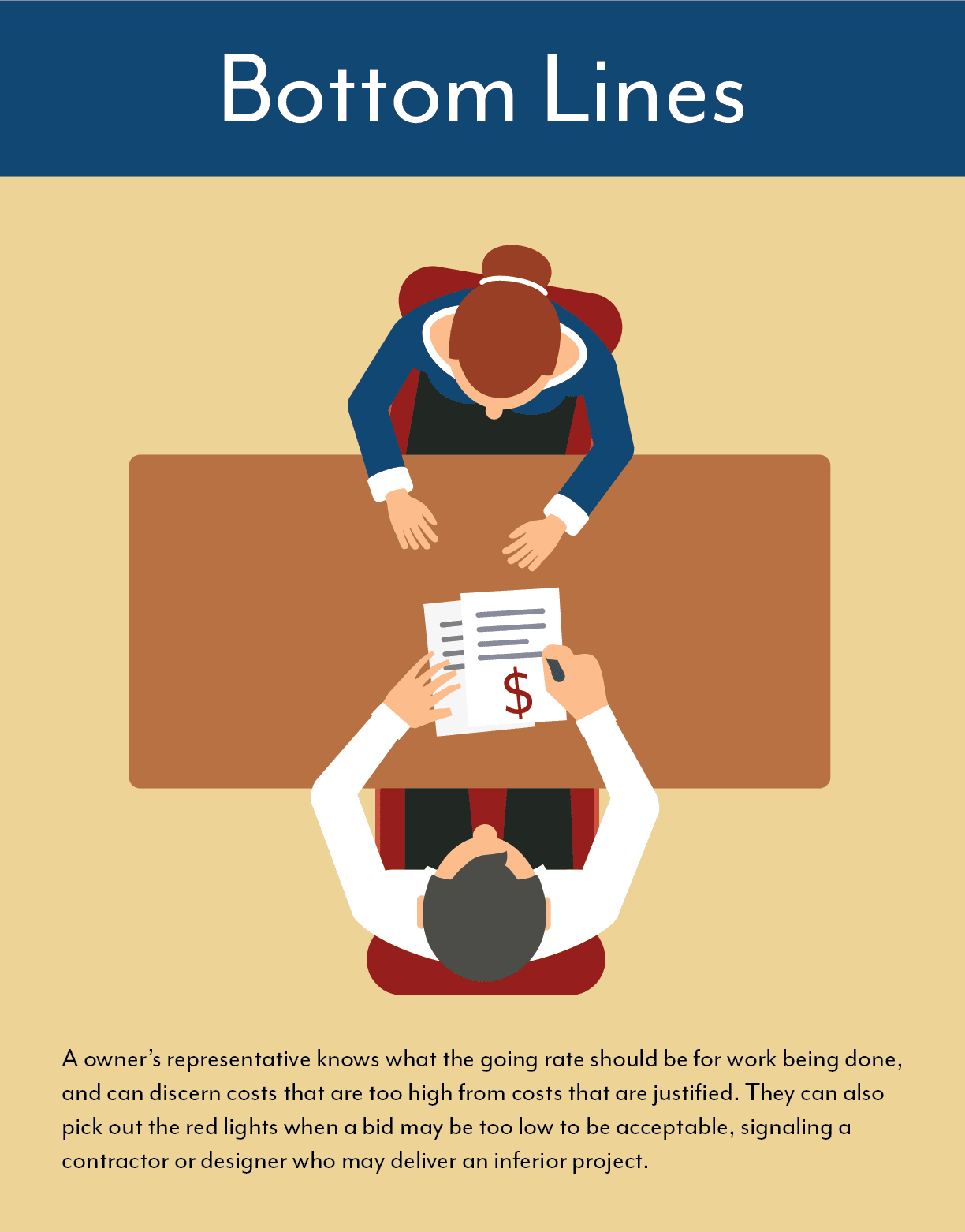 They can also pick out the red lights when a bid may be too low to be acceptable, signaling a contractor or designer who may deliver an inferior project. For an owner, the low bid may be hard for them to ignore. However, the expertise of an owner’s rep will note when a bid is too good to be true, and investigate further.